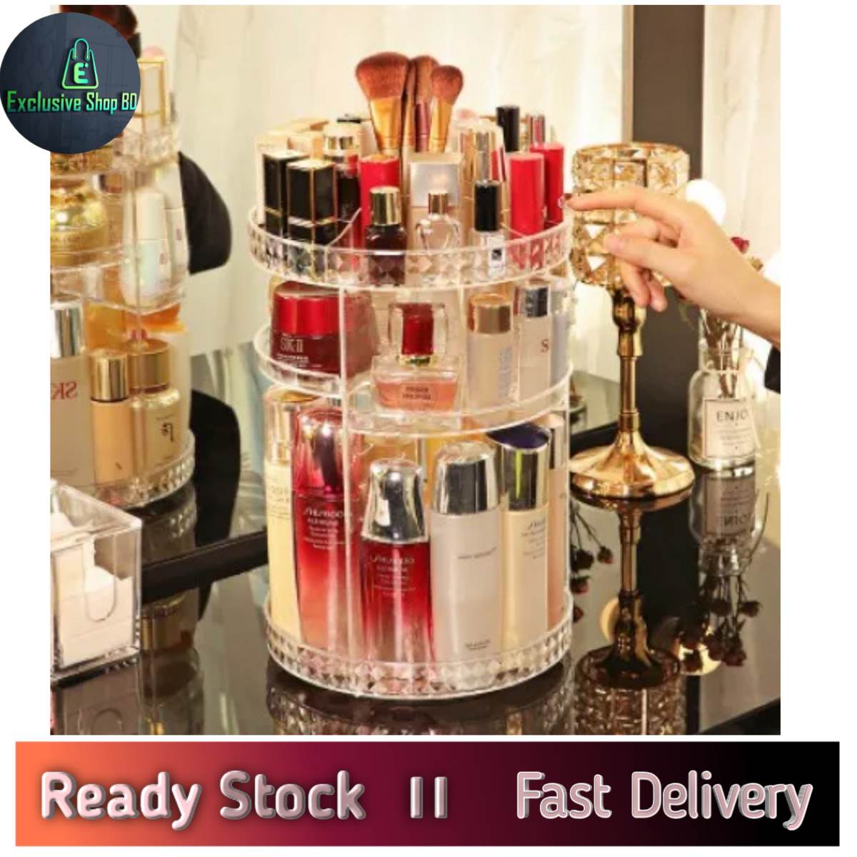 - Need a fantastic way to store all your beauty items? Do you find it difficult to find that lipstick or mascara in your drawers? The Jerrybox 360° Rotation Makeup Organizer provides a stylish and practical way to enhance your daily cosmetic routine!The Jerrybox Makeup Organizer Keeps Your Cosmetics NeatThis unique all-in-one makeup organizer is designed to accommodate all of your cosmetics and accessories neatly, while taking up very little space. It perfectly stores your cosmetics including lipsticks, lip gels, nail polish, makeup brushes, cheek color, eyebrow pencils, foundation sticks, beauty gadgets, necklaces, rings and more. With this awesome organizer, you won’t be troubled by messy cosmetics scattered on your vanity table anymore!360 Degree Rotation and Adjustable Design Add Extra ConvenienceThis item is easy to assemble and disassemble as the guide describes. With its steady 360° rotating base, you can instantly get access to your cosmetics by rotating the organizer. Six adjustable layersenable you to adjust the height of the tray to accommodate different types of cosmetics and containers in all shapes and sizes.SpecificationsMaterial: ABSColors: WhiteProduct dimensions:32 cm x 22 cm (12.6 in x 8.7 in)Easy Installation Guide1.Insert one of the 2 partitions into the base plate.2.Intersect the other partition into the base plate.3.Securethe 4 bottom joints with rubber rings.4.Insert the 4 trays into partition slots according to your preference.5.Insert the top plate into the partitions.6.Secureupper joints with rubber rings.