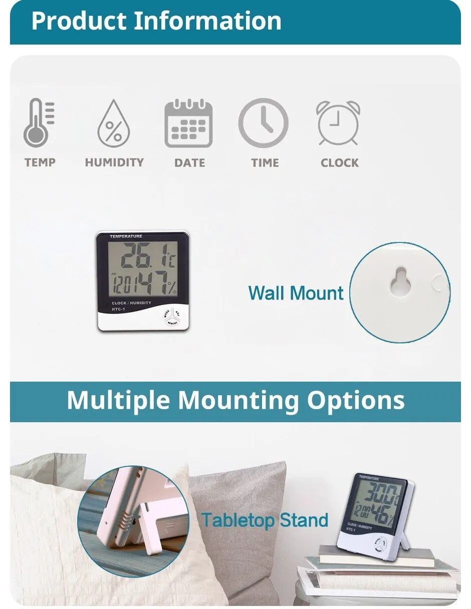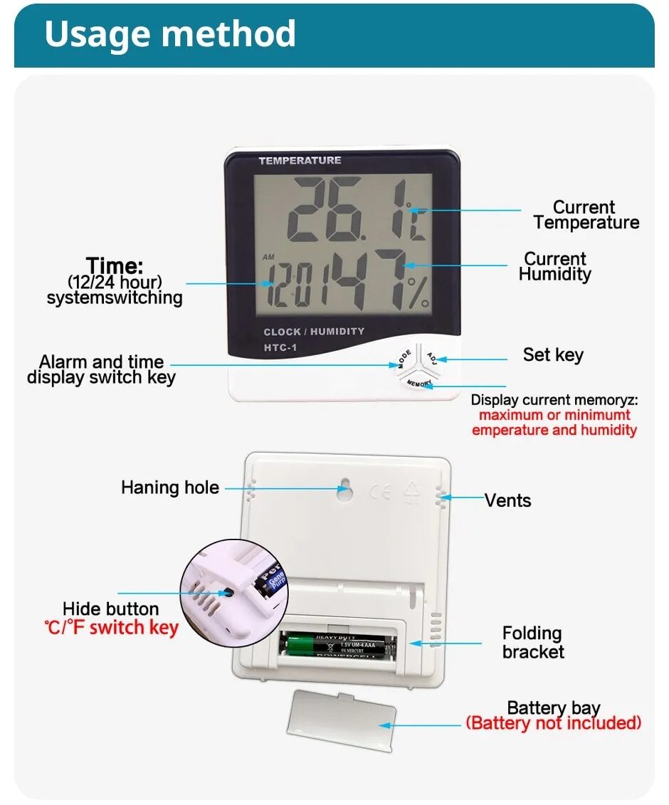 - HTC-2 Indoor LCD Digital Temperature Humidity Meter Thermometer With Alarm Clock