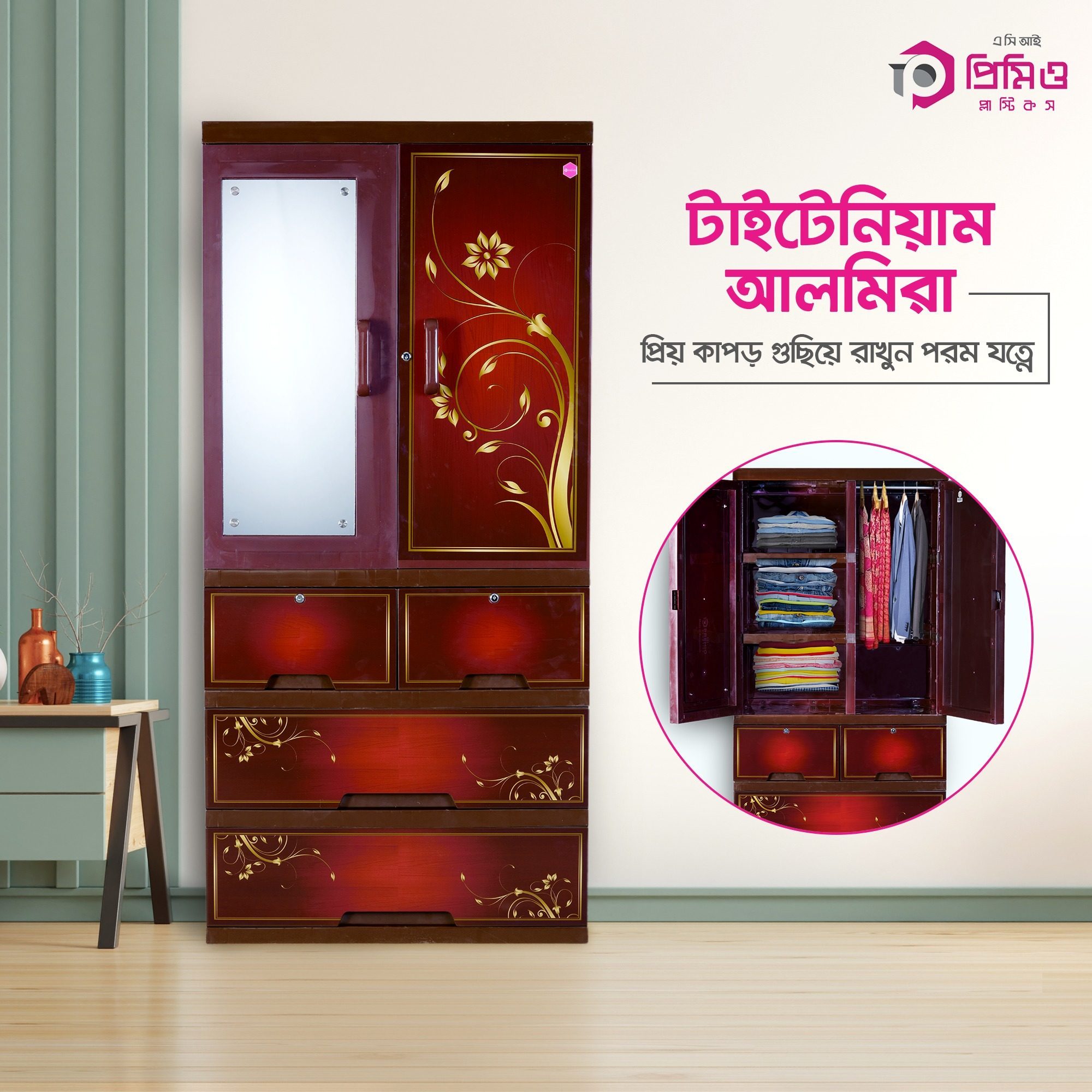 Titanium Almirah Glass 3 Drawer – Splash Lacquer is an innovative storage solution from ACI Premio Plastics. For the first time Premio brings Mirror & Drawer combination in plastic-made almirah.